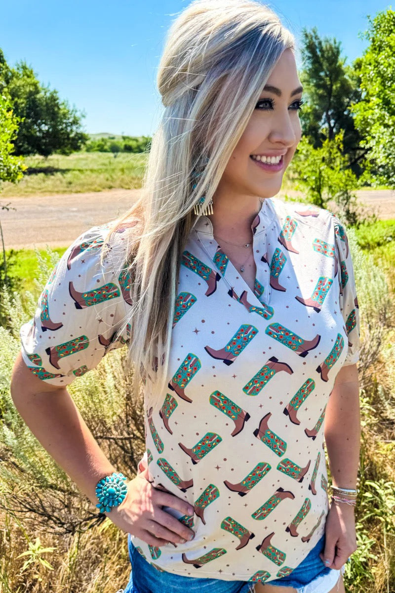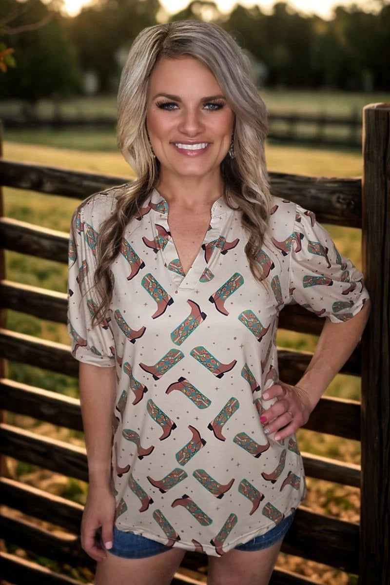 The Better In Boots Top features a cute and fun boots pattern that adds a touch of dressy flair. Made with buttersoft fabric, it flatters your figure and is perfect for any occasion. Upgrade your wardrobe with this must-have top!