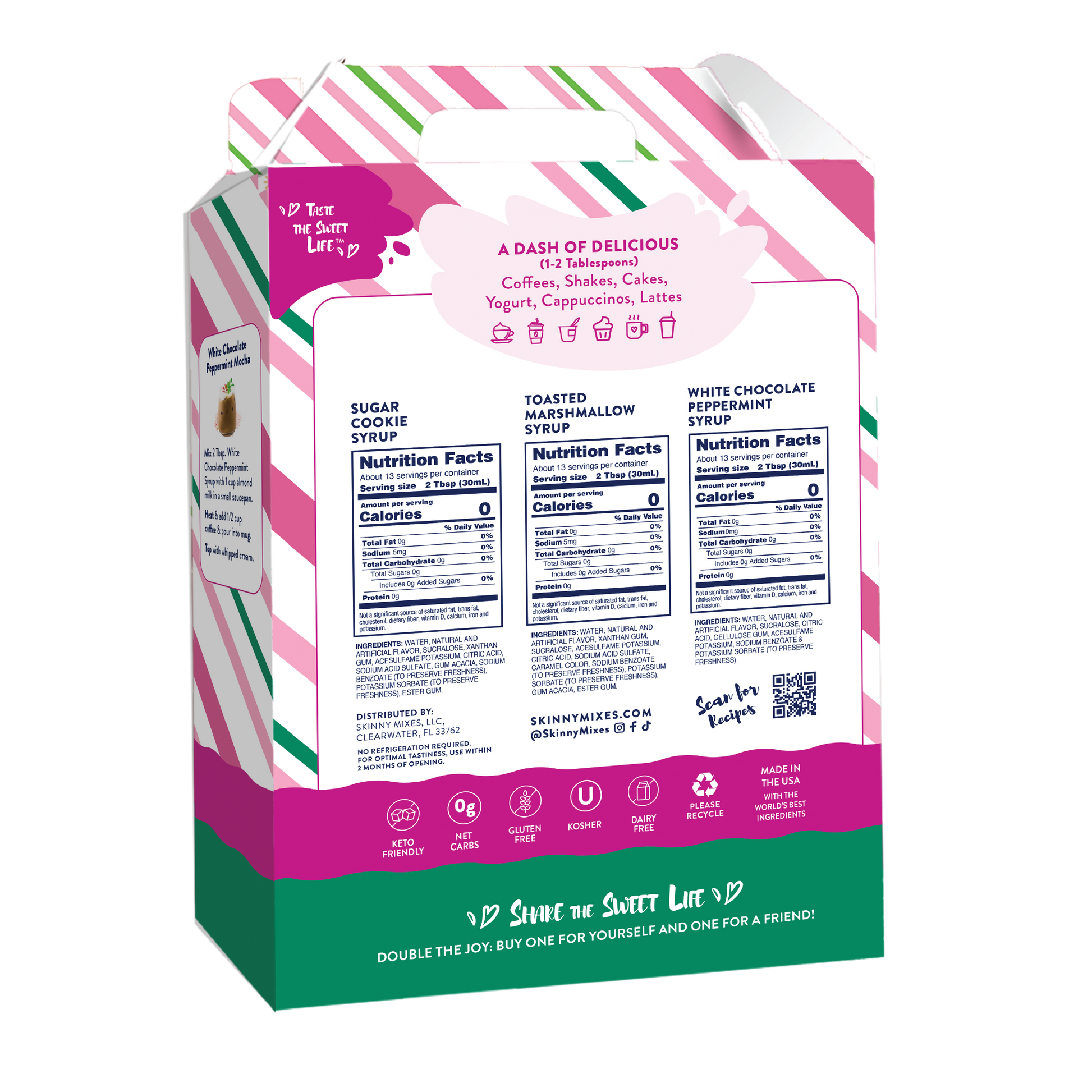Your winter holidays will become more special with our scrumptious assortment of syrups in a seasonal holiday gift box. Included is 1 bottle of each, Toasted Marshmallow, White Chocolate Peppermint, and Sugar Cookie syrups. Our assortment of syrups also make a wonderful gift for friends and family. Add guilt free flavor to hot chocolate, coffees, lattes, protein shakes, smoothies, baking, oatmeal or just about anything.