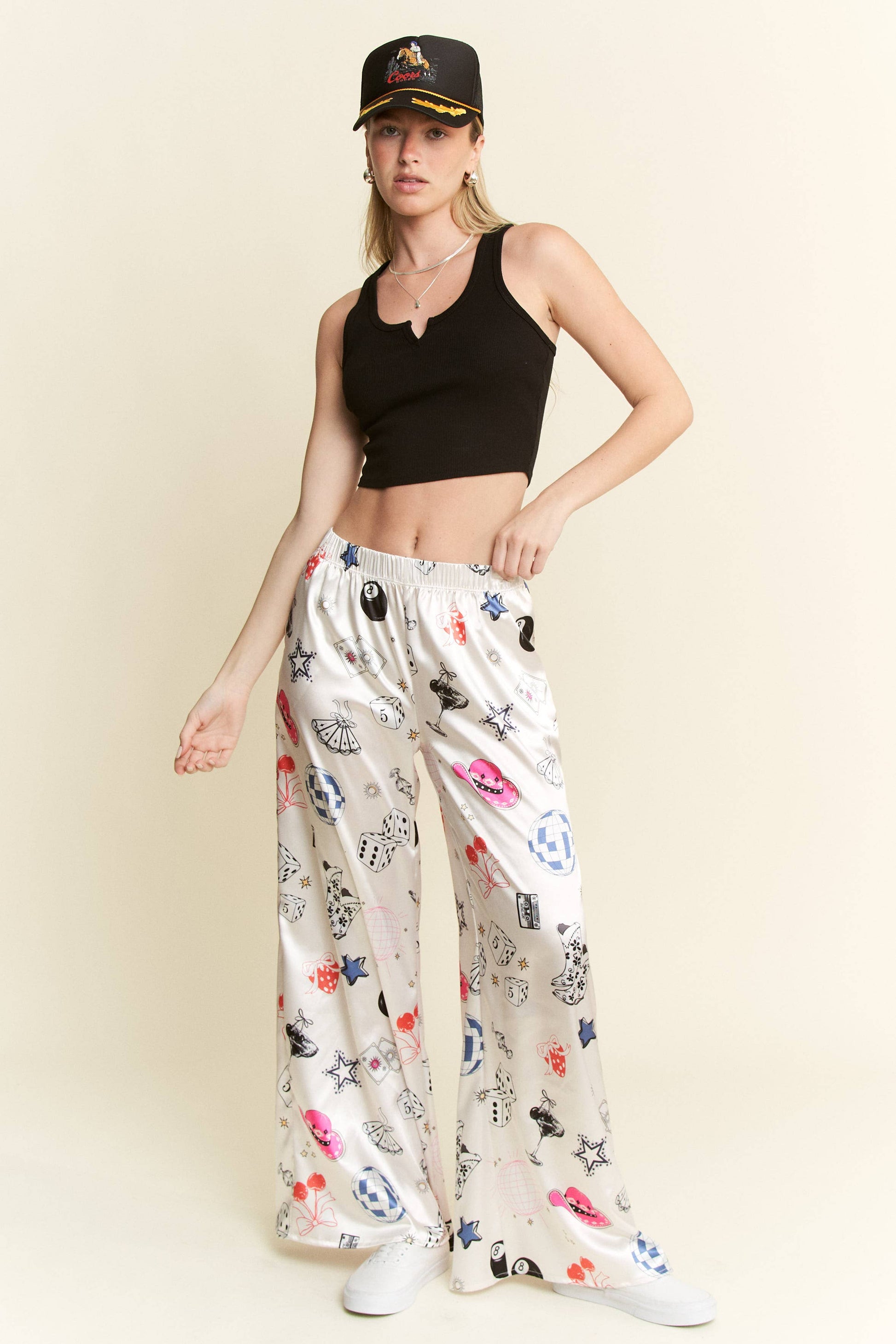 PARTY COLLAGE SATIN PANTS: Cream / S