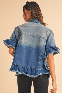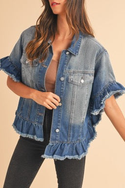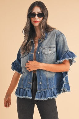 Peacock Blue Raw Edge Bell Short Sleeve Denim Jacket