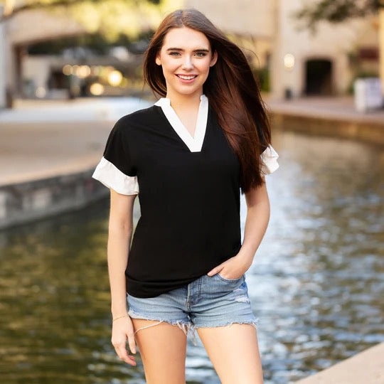 Game Day Ruffle Sleeve V-Neck Top with Crisp White Trim