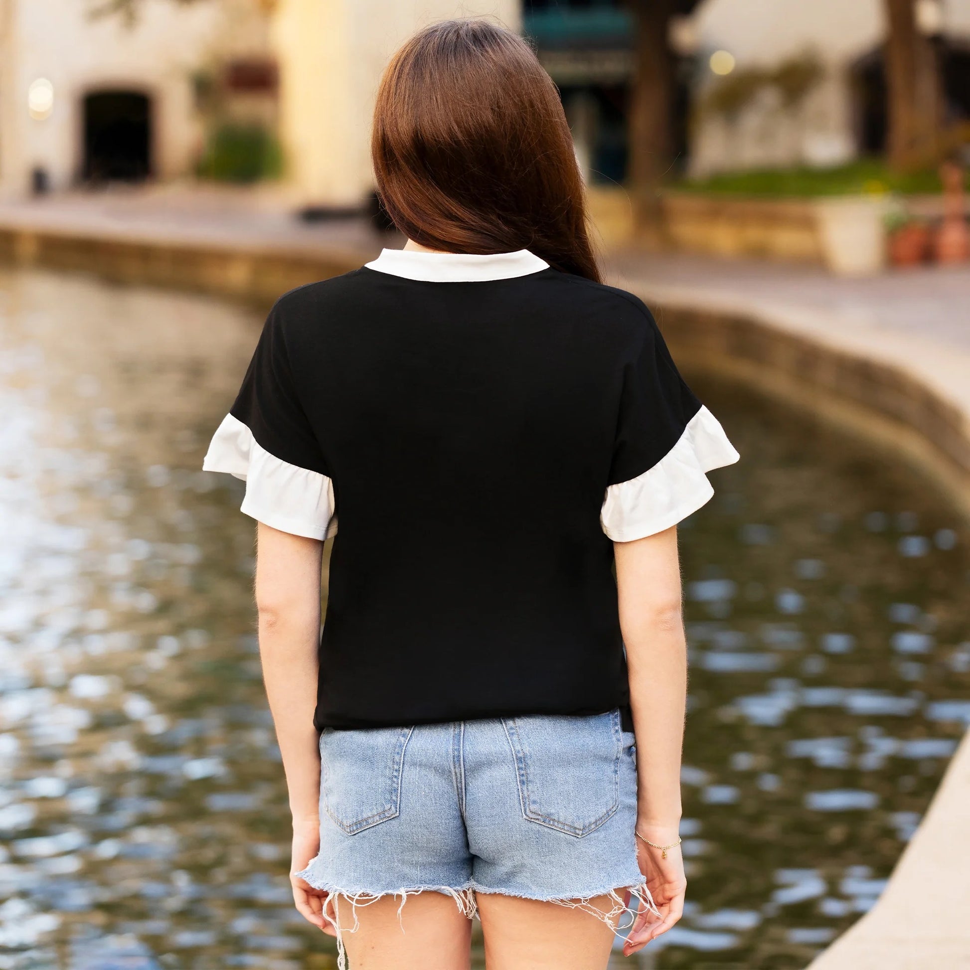 Ruffle Sleeves V-Neck Top with White Trim