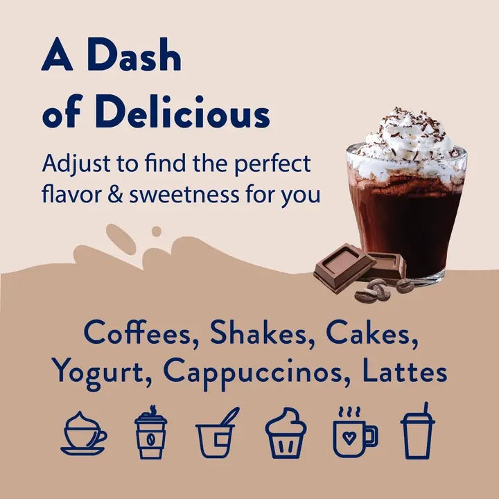 Rich, luscious, and pure chocolate aroma and flavor. Add guilt-free flavor to coffees, lattes, tea, protein shakes, smoothies, baking, oatmeal, or just about anything. π« 0 Calories. 0 Sugar. 0 Carbs. π° 750 ml/25.4 fl. oz. Bottle - 25 Servings! β Gluten-Free & Kosher. π± Keto-Friendly. πΊπΈ Made in the USA.