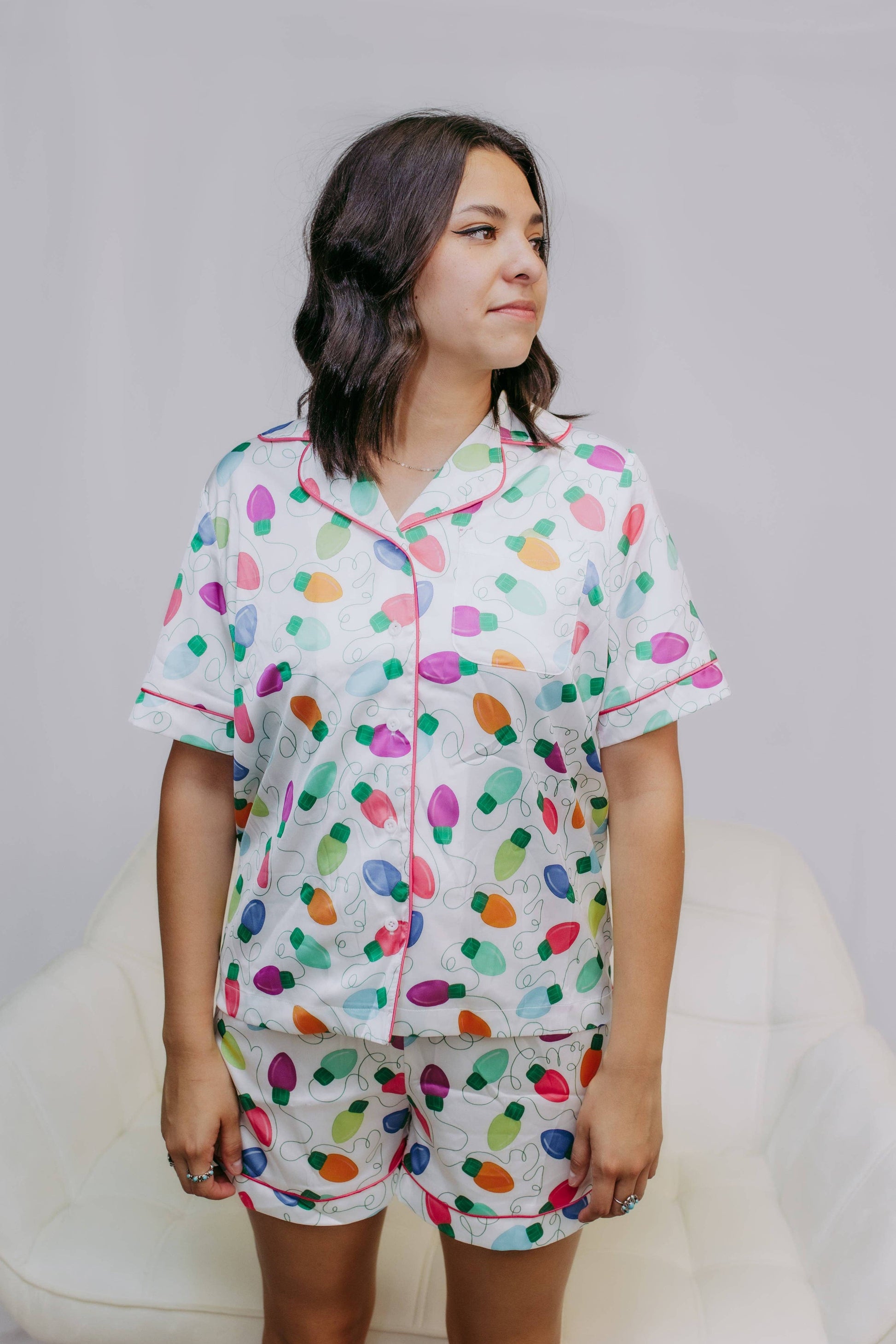 Get into the holiday spirit with our Christmas Lights Satin Pajama Short Set! This festive ensemble combines comfort and style, perfect for cozying up during the chilly season. The short-sleeve button-up shirt features a playful Christmas lights print, adding a cheerful touch to your loungewear. The soft satin fabric feels luxurious against the skin, while the relaxed fit ensures you can move freely as you unwind. The matching shorts have an elastic waistband for a comfortable fit, complete with a delicate drawstring for added style. The playful design captures the essence of the season, making it ideal for holiday movie marathons or festive gatherings. Celebrate the joy of the holidays in comfort and style with this delightful satin pajama set—perfect for gift-giving or treating yourself! -Christmas -Holiday -Pajamas