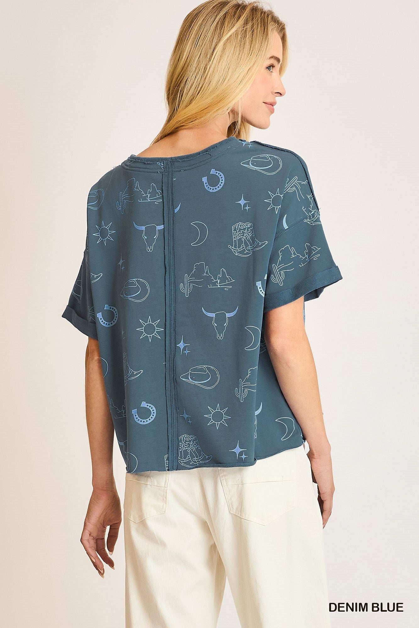 Boxy Cut Round Neck French Terry Top with Graphics & Frayed Hem