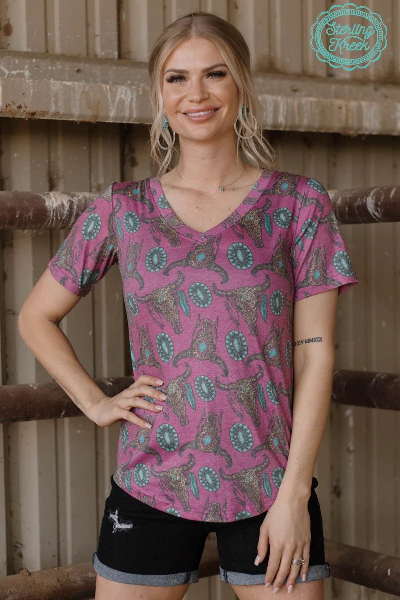 Be the most stylish wild child around in this Wild Thing Top! Made with a soft pink v-neck and rocking cheetah cow skulls with turquoise conchos, you'll be turning heads and making a fashion statement. Unleash your wild side!